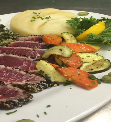 Your choice of crusted tuna pan seared to your liking served over mashed potatoes and fine creamed spinach.